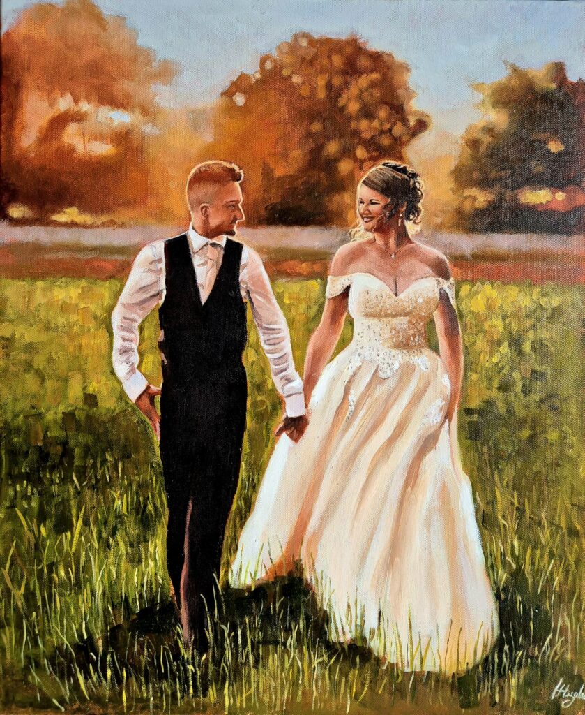 I will take photos during or after the ceremony and set up my easel and paint throughout the day. The painting will not be fully completed on the day. You will be shown the painting so far, it will then be taken to the studio to be finished dried and varnished. We allow 6 weeks for it to be finished, but it may take as little as 3 weeks.